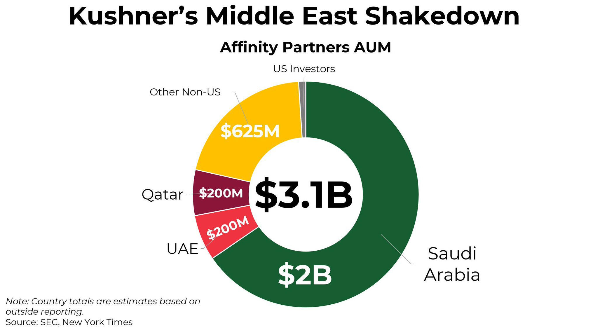 - In April 2022, the New York Times reported that six months after leaving the White House, Kushner secured a $2 billion investment from a fund led by Saudi Crown Prince Mohammed bin Salman for his new private equity firm, Affinity Partners.- The Saudi fund's investment screening panel expressed serious misgivings about the Kushner deal, including "the inexperience of the Affinity Fund management"; due diligence being “unsatisfactory in all aspects”; and the possibility that the kingdom would be responsible for “the bulk of the investment and risk” (NYT).- Crown Prince Mohammed bin Salman (MBS) subsequently overruled the panel's concerns and approved the investment.- Kushner developed an exceptionally close rapport with MBS during the Trump administration, taking on the Saudi portfolio, chatting regularly on WhatsApp, and reportedly discussing sensitive matters like the names of Saudis disloyal to MBS.- After the October 2018 murder of journalist Jamal Khashoggi, which the CIA concluded MBS ordered, Kushner became MBS's "most important defender inside the White House," according to NYT.- Kushner was also involved in policies favorable to Saudi interests, such as supporting the Saudi-led intervention in Yemen's civil war. In May 2017, Kushner pushed for a massive $110 billion arms sale to Saudi Arabia despite concerns from career national security officials. In 2018, he backed MBS during a power struggle when the crown prince detained Saudi royals and businessmen.- Keep in mind that Jared Kushner's top-secret security clearance was initially denied by two career specialists who rejected his application due to concerns raised by the FBI about his foreign contacts related to Israel, UAE, Russia, and his family business ties posing potential conflicts, but after White House Counsel Don McGahn recommended against granting clearance based on these issues, Trump the next day personally ordered his Chief of Staff John Kelly to approve Kushner's clearance anyway.- Jared Kushner secured almost all—99%, per SEC filings—of the $3 billion for his investment fund from foreign governments, including Saudi Arabia, Qatar, and the UAE, and undisclosed sources like Foxconn founder Terry Gou